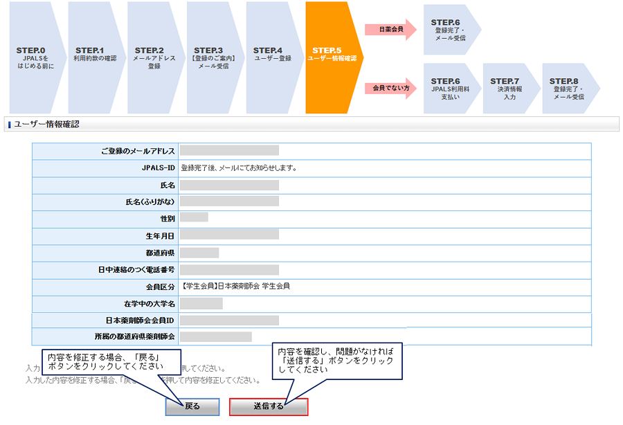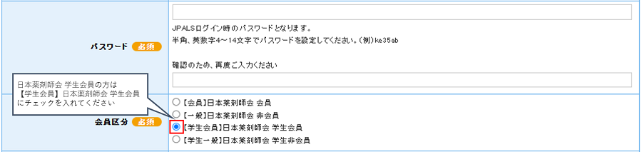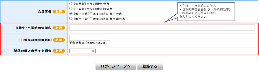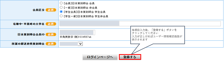 入力項目に不備があると、その項目に赤文字で「正しい形式で入力して下さい。」などのメッセージが表示されます。 表示メッセージに従い、入力内容を修正してください。 会員区分【学生会員】日本薬剤師会 学生会員で登録する場合、「生年月日」「日本薬剤師会会員ID」「所属の都道府県薬剤師会」 の内容が正しいか本システムで照合します。 照合できないとユーザー登録できませんので、ご注意ください。 前に戻る 次へ進む ご利用ガイドメニューに戻る |