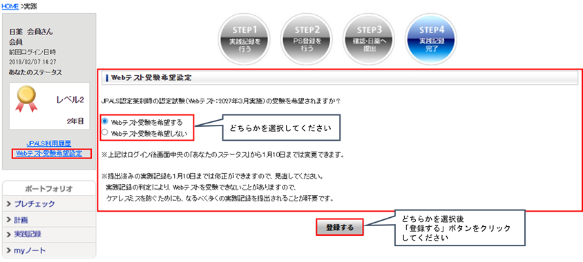 18本の実践記録の登録が完了しますと、18本目を提出した後にWebテスト受験希望設定画面が出ます。