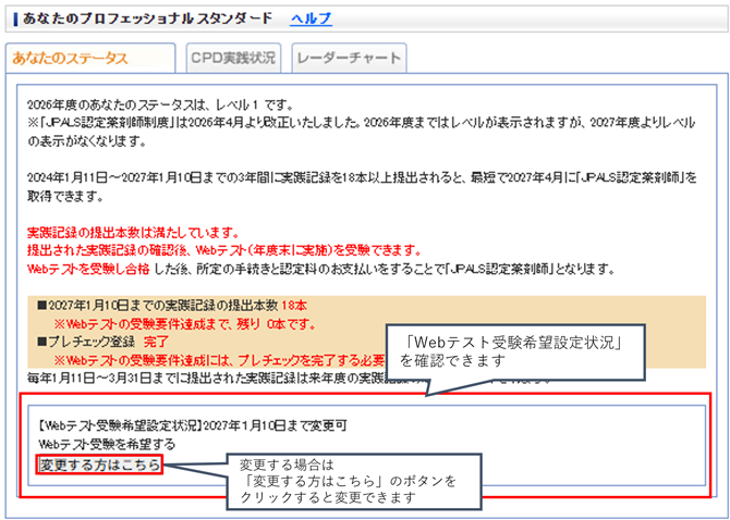Webテスト受験希望設定状況から確認できます。 Webテスト受験設定は、受験する年の1月10日まで、「変更する方はこちら」のボタンから変更できます。 前に戻る 次へ進む ご利用ガイドメニューに戻る |
