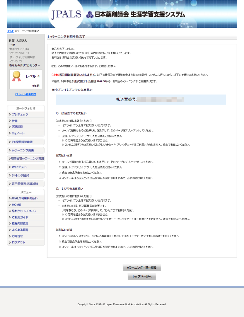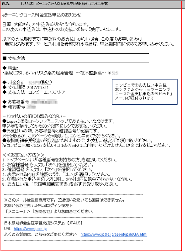 本システムから「eラーニングコース料金支払申込のお知らせ」メールが送付されます。 説明文の内容をご確認いただき、選択されたコンビニでお支払いください。 eラーニング利用料金をお支払い後、eラーニングを受講するまで数日かかります。 前に戻る 次へ進む ご利用ガイドメニューに戻る |